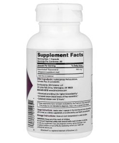 VeganGluten-FreeNon GMOSustained ReleaseDietary SupplementMicronized providing 2.5x higher bioavailability.Increased serum blood levels of free resveratrol. Sustained release over 12 hours.