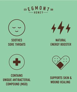 VitalityNon GMO Project VerifiedBPA FreeHalalKosher KiwiSoothes the ThroatGeneral Wellness SupportA Natural Daily BoostEgmont Manuka Honey is based under Mount Taranaki, a volcano that defines the region. Our Manuka Honey is produced by bees collecting nectar from the Manuka plant that grows wildly in New Zealand. Nothing to hide; nothing but nature. Certified MGO ensures this honey contains at least 265mg/kg of methylglyoxal as tested by an IANZ approved laboratory. The UMF™ rating system independently certifies natural components found in Manuka Honey to assure potency, purity, authenticity, & freshness.