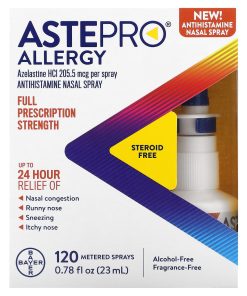 Azelastine HCl 205.5 mcg Per SprayFull Prescription StrengthSteroid FreeUp to 24 Hour Relief of: Nasal Congestion, Runny Nose, Sneezing, Itchy Nose120 Metered SpraysAlcohol-FreeIndoor & Outdoor Allergy ReliefAstepro® is a first-of-its-kind, steroid-free nasal antihistamine spray that starts working in 30 minutes for fast-acting 24-hour relief.Uses: Temporarily relives these symptoms due to hay fever or other upper respiratory allergies:nasal congestionrunny nosesneezingitchy nose