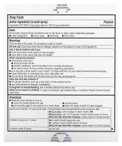 Only for use in the nose. Do not spray in eyes or mouth.Do not use if you have ever had an allergic reaction to this product or any of its ingredientsAsk a doctor before use if youhave had recent nose ulcers or nose surgeryhave had a nose injury that has not healedWhen using this productdrowsiness may occuravoid alcoholic drinksalcohol, sedatives, and tranquilizers may increase drowsinessbe careful when driving a motor vehicle or operating machineryyou may get a bitter taste in your mouth. To help avoid this, tilt your head downward while spraying.nasal discomfort or sneezing may occur right after usedo not share this bottle with anyone else as this may spread germsStop use and ask a doctor ifan allergic reaction, such as a skin rash, to this product occursyou have severe or frequent nosebleedsIf pregnant or breast-feeding, ask a health professional before use.Keep out of reach of children. In case of overdose, get medical help or contact a Poison Control Center