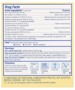 Drug FactsActive ingredients** (in each vial)PurposeAllium cepa 3C HPUS (0.125 mL)Relieves sneezing and runny noseApis mellifica 15C HPUS (0.125 mL)Relieves nasal congestionEupatorium perfoliatum 3C HPUS (0.125 mL)Relieves body aches associated with coldsGelsemium sempervirens 6C HPUS (0.125 mL) (contains less than 10-11 mg gelsemine alkaloids)Relieves headaches associated with coldsKali bichromicum 6C HPUS (0.125 mL) (contains less than 10-10 mg chromium)Relieves nasal dischargeNux vomica 3C HPUS (0.125 mL) (contains less than 10-5 mg strychnine alkaloids)Relieves sneezing attacksPhytolacca decandra 6C HPUS (0.125 mL)Relieves mild feverPulsatilla 6C HPUS (0.125 ml)Relieves colds with a loss of taste and smellInactive ingredients: Alcohol, purified water.The letters HPUS indicate that this ingredient is officially included in the Homeopathic Pharmacopoeia of the United States.**C, K, CK, and X are homeopathic dilutions.