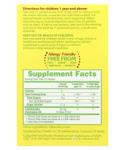 #1 Pediatrician Recommended Brand♦Helps Keep Kids HealthyHelps Support Kids’ Immune & Digestive SystemsProbiotic SupplementNo Flavor AddedNaturally Sourced LGG®Most Researched Strain in Children†Purity & Potency***Dairy – Gluten^ – Soy FreeThe Culturelle® Difference∞Supports Natural Immune DefensesBoosts Digestive HealthCulturelle® Kids Purely Probiotics® Packets are formulated to help keep your kids healthy & at their best, for whatever the day may bring.This product contains LGG® probiotic, the most clinically studied strain in children†, to help support both immune and digestive health.Mix with your child’s favorite food or beverage.Our Brand ValuesWe’re on a mission to inspire better health & wellness for you & your family.We believe in integrity, so we hold ourselves to the highest standards of truth.We believe in the natural power your body’s microbiome, & scientific research & products that will unlock its full potential.We believe in uncompromising quality, safety & proven efficacy.We believe in empowering you to embrace every day with confidence.Allergy Friendly Free FromMilkWheatEggsTree NutsPeanuts†Based on the number of studies Lactobacillus rhamnosus GG as of January 2019.***Guaranteed potency through date on box when stored as directed.♦Based on a 2018 survey among pediatricians recommending a probiotic brand.^Meet the FDA’s guidelines for gluten-free.‡Not a reduced calorie food.∞ Excludes gummy formulas