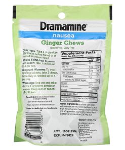 #1 Name in Motion Related Nausea Relief Relieves NauseaClinically Tested Dose†Morning SicknessMotion SicknessUpset Stomach††Occasional Heartburn Non-Drowsy Dietary Supplement Great Tasting Gluten FreeDairy Free Dramamine Ginger Chews contain a clinically tested dose of ginger in a convenient soft chew. It’s available in a great-tasting lemon-honey-ginger flavor and is safe for frequent use since it’s made with natural ginger extract.†Extract equivalent to clinically tested dose of powdered ginger for Morning or Motion sickness.††Based on practices of traditional medicine