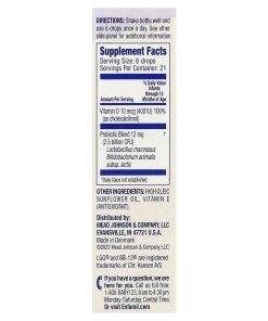 Mead Johnson Nutrition™Dual Probiotics#1 Infant Vitamin BrandLGG®, BB-12® & Vit D DropsSupports Your Baby’s Immune & Digestive HealthDietary Supplement1 Bottle With Built in DropperNourish your baby’s development with Enfamil® ProbioticsHas LGG® & BB-12® probiotics: Two of the most clinically studied probiotics Probiotics clinically shown to support the immune system‡, Designed to support the digestive system where nutrient absorption occursVitamin D, a nutrient important to build strong bonesNo artificial sweeteners, flavors or silicone dioxideAlso consider Enfamil® Poly· Vi·Sol®, It is an ideal multivitamin supplement during your child’s transition to solid foods, during growth spurts, or for the picky eater. ‡Clinical studies in LGG® and BB-12® probiotics individually, given in probiotic supplement or formula during infant and/or toddler years