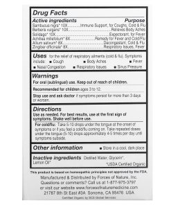 Drug FactsActive IngredientsPurposeSambucus nigra* 10XImmune Support, for Coughs, Cold & FluBerberis Vulgaris* 10XRelieves Body AchesSolidago* 10XExpectorant, for FeverAchillea millefolium* 8XRemedy for Fever and Cold/FluAllium sativum* 8XDecongestant, Cold & FluZingiber officinale* 8XRespiratory Issues, FeverInactive IngredientsDistilled water, glycerin-, lemon oil**USDA Certified Organic