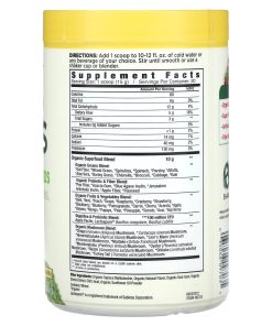 Farm FreshEst. 1975Alkalizing Formula50 Organic Super FoodsFruits, Vegetables, Super Greens, Mushrooms & ProbioticsUSDA Organic5 g FiberNo Added SugarVeganDietary SupplementCertified Organic by OTCOMade With:Organic GreensSuper FruitsAntioxidantsFiber BlendProbioticsPrebioticsVegetablesAloe Vera