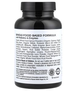 Vegetable capsule (hypromellose, water).Organic whole food sprout powders (organic quinoa, organic mung bean, organic millet), probiotic blend (50 million cfus acidophilus/b. bifidum), plant enzyme blend (lipase, lactase, protease, hemicellulase, cellulase, alpha-galactosidase, amylase, bromelain, papain, acid stable protease, fungal amylase (non-pathogenic aspergillus orzae)), fructo-oligosaccharides, whole food pomegranate juice powder, organic whole food freeze-dried fresh acai powder, whole food mangosteen hull powder, organic whole food noni fruit powder. Manufactured in a facility that stores and/or processes milk, eggs, fish, crustacean shellfish, tree nuts, peanuts, wheat and soybeans.