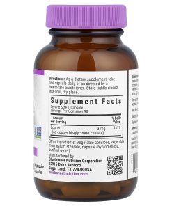 Non GMO Project Verified Brain & Immune HealthAlbion Minerals Dietary SupplementVeganKosher PareveGluten FreeBluebonnet’s Chelated Copper Vegetable Capsules are formulated with 3 mg of elemental copper from fully reacted copper bisglycinate, an amino acid chelate mineral from Albion. Copper is an essential element that is necessary for nervous system and immune health.