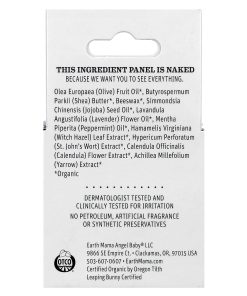 Olea europaea (olive) fruit oil*, butyrospermum parkii (shea) butter*, beeswax*, simmondsia chinensis (jojoba) seed oil*, lavandula angustifolia (lavender) flower oil*, mentha piperita (peppermint) oil*, hamamelis virginiana (witch hazel) leaf extract*, hypericum perforatum (St. John’s wort) extract*, calendula officinalis (calendula) flower extract*, achillea millefolium (yarrow) extract*.*Organic