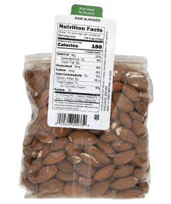 Raw almonds. Steam pasteurized.Contains: Almond.Processed on shared equipment with peanuts, tree nuts, soy, milk, egg, sesame or wheat products.