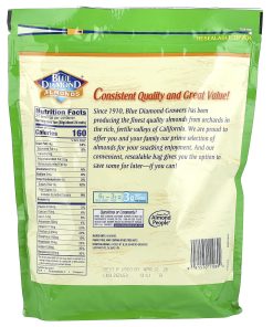 Resealable ZipperIrresistible Snacking!Smart Eating!®KosherAmerican Heart Association Certified – Meets Criteria for Heart-Healthy FoodFrom The Almond People®6 g Total Carbs – 3 g Fiber = 3 g Net Carbs Per ServingConsistent Quality and Great Value!Since 1910, Blue Diamond Growers has been producing the finest quality almonds from orchards in the rich, fertile valleys of California. We are product to offer you and your family our prime selection of almonds for your snacking enjoyment. And our convenient, resealable bag gives you the option to save some for later – if you can!Scientific evidence suggests, but does not prove, that eating 1.5 ounces per day of most nuts, such as almonds, as part of a diet low in saturated fat and cholesterol may reduce the risk of heart disease. See nutrition information for fat content.