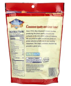 Resealable Zipper1 lb Value PackIrresistible Snacking!Smart Eating!®2 g Net Carbs Per ServingKosher5 g Total Carbs – 3 g Fiber = 2 g Net Carbs Per Serving From the Almond People®Consistent Quality and Great Value!Since 1910, Blue Diamond Growers has been producing the finest quality almonds from orchards in the rich, fertile valleys of California. We are proud to offer you and your family our prime selection of almonds for your snacking enjoyment. This large, convenient, resealable bag provides a great value.