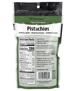 Resealable PackageShelled RoastedDouble Certified Organically GrownLow SodiumPure & Purifying™Kosher PareveOCIA Certified OrganicGluten FreeCreation and Maintenance of Purity in Food®Shelled, whole, fire-roasted California pistachios with a mist of EDEN Sea Salt. Purely delicious, rewarding snack food.