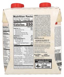 Naturally & Artificially Flavored23 g Protein Per Serving4 g Net Carbs* Per Serving1 g Sugar Per Serving7 g Fiber Per Serving14 g of Total FatDeliciously FillingHelps Burn Fat as Part of the Atkins® Approach**Made with High Quality ProteinLow Glycemic†Gluten FreeDeliciously SatisfyingNo Artificial Growth HormonesAtkins® shakes give you essential nutrients, as well as protein, carbs, and fiber to satisfy your hunger and provide steady energy throughout the day.No significant difference has been shown between milk derived from rBST-treated and non rBST-treated cows.† Glycemic load of under 10.**Enjoy as part of the Atkins 20® eating approach.*Total Carbs (8 g) – Fiber (4 g) = 4 g Atkins Net Carbs