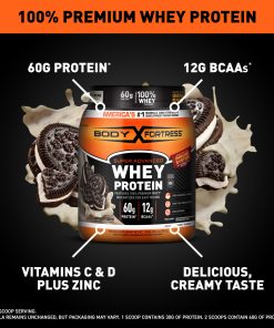 Featuring 100% WheyHelps Support Your Immune System America’s #1 Muscle and Strength Development Powder Brand**Naturally& Artificially FlavoredFeatures 100% Premium WheyInstantized for Easy MixingProtein SupplementNSF® Contents CertifiedHelps Support Your Immune System with Vitamin C & D Plus Zinc Build Lean Muscle & StrengthBoost Post-Workout RecoveryZero Aspartame Gluten Free cGMP ManufacturedManufactured According to cGMP Standards, as is Required for all Dietary SupplementsYour Body – Your Fortress®Whey Protein For Optimal Recovery Made from 100% premium whey and instantized for easy mixing. Engineered complete protein powder for sustained energy, high digestibility and fast absorption. Body fortress® super advanced whey protein is formulated to help you replenish your body and rebuild lean muscle faster, so come tomorrow you can push even harder. Super Advanced Whey ProteinProtein and Amino Acid Profile30 g Protein*6 g BCAAs* From Protein*Body Fortress® Complete Protein Sustained EnergyHigh Digestibility Fast Absorption The Body Fortress® workout outlook You give 100% in training and body fortress® gives you 100% right back. Like you, we prefer hard work to hype. That’s why all of our products are carefully crafted with proven ingredients that will help you reach your fitness goals. Our full line of premium quality muscle building supplements will give you the power to train harder and recover faster.*Per scoops.**Source: IRI, MULO, 52 WE, Units Sold, 1/27/23, excluding online sales.