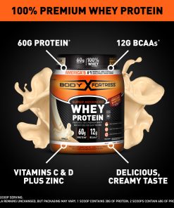Helps Support Your Immune System with Vitamins C & D, Plus ZincFeatures 100% Premium Whey Instantized for Easy Mixing30 g Protein*6 g BCAAs*Naturally & Artificially FlavoredContents Certified NSFProtein SupplementBuild Lean Muscle & StrengthBoost Post-Workout RecoveryZero Aspartame-Gluten FreeAmerica’s #1 Muscle and Strength Development Powder Brand**cGMP Manufactured – Manufactured According to cGMP Standards, as is Required for all Dietary SupplementsWhey Protein for Optimal Recovery Made from 100% premium whey and instantized for easy mixing. Engineered complete protein powder for sustained energy, high digestibility and fast absorption. Body fortress® super advanced whey protein is formulated to help you replenish your body and rebuild lean muscle faster, so come tomorrow you can push even harder.Super Advanced Whey ProteinProtein and Amino Acid Profile 30 g Protein* 6 g BCAA’s From Protein*Body Fortress® Complete ProteinSustained EnergyHigh DigestibilityFast AbsorptionThe Body Fortress® Workout Outlook You give 100% in training and body fortress® gives you 100% right back. Like you, we prefer hard work to hype. That’s why all of our products are carefully crafted with proven ingredients that will help you reach your fitness goals. Our full line of premium quality muscle building supplements will give you the power to train harder and recover faster.*Per Scoop**Source: IRI, MULO, 52 WE, Units Sold, 1/27/23, excluding online sales.