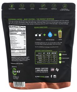 2 Espresso Shots20 g Whey Protein1 g SugarMade with Real Espresso CoffeeGluten FreeHigh ProteinLow FatNo Added SugarVegetarianNo Artificial Colors or FlavorsEspresso Coffee + Whey Protein = The Perfect BeveragePower your morning, beat that afternoon slump or give your workouts a supercharged boost with this delicious, all-in-one nutritional drink. With rich flavor, real espresso coffee, and whey protein, Chike Iced Coffee is what your mind and body craves to energize your day. So say goodbye to the expensive, empty calories of coffeehouse drinks and hello to Chike Iced Coffee – the perfect beverage!