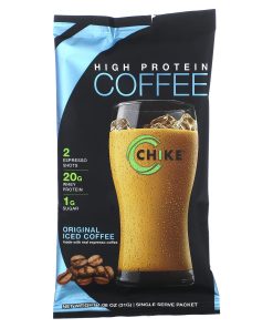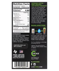 Coffee + Protein2 Espresso Shots20 g Whey Protein1 g SugarMade with Real Espresso CoffeeGluten FreeHigh ProteinLow FatNo Added SugarVegetarianNo Artificial Colors or FlavorsEspresso Coffee + Whey Protein = The Perfect BeveragePower your morning, beat that afternoon slump or give your workouts a supercharged boost with this delicious, all-in-one nutritional drink. With rich flavor, real espresso coffee, and whey protein, Chike Iced Coffee is what your mind and body craves to energize your day. So say goodbye to the expensive, empty calories of coffeehouse drinks and hello to Chike Iced Coffee – the perfect beverage!