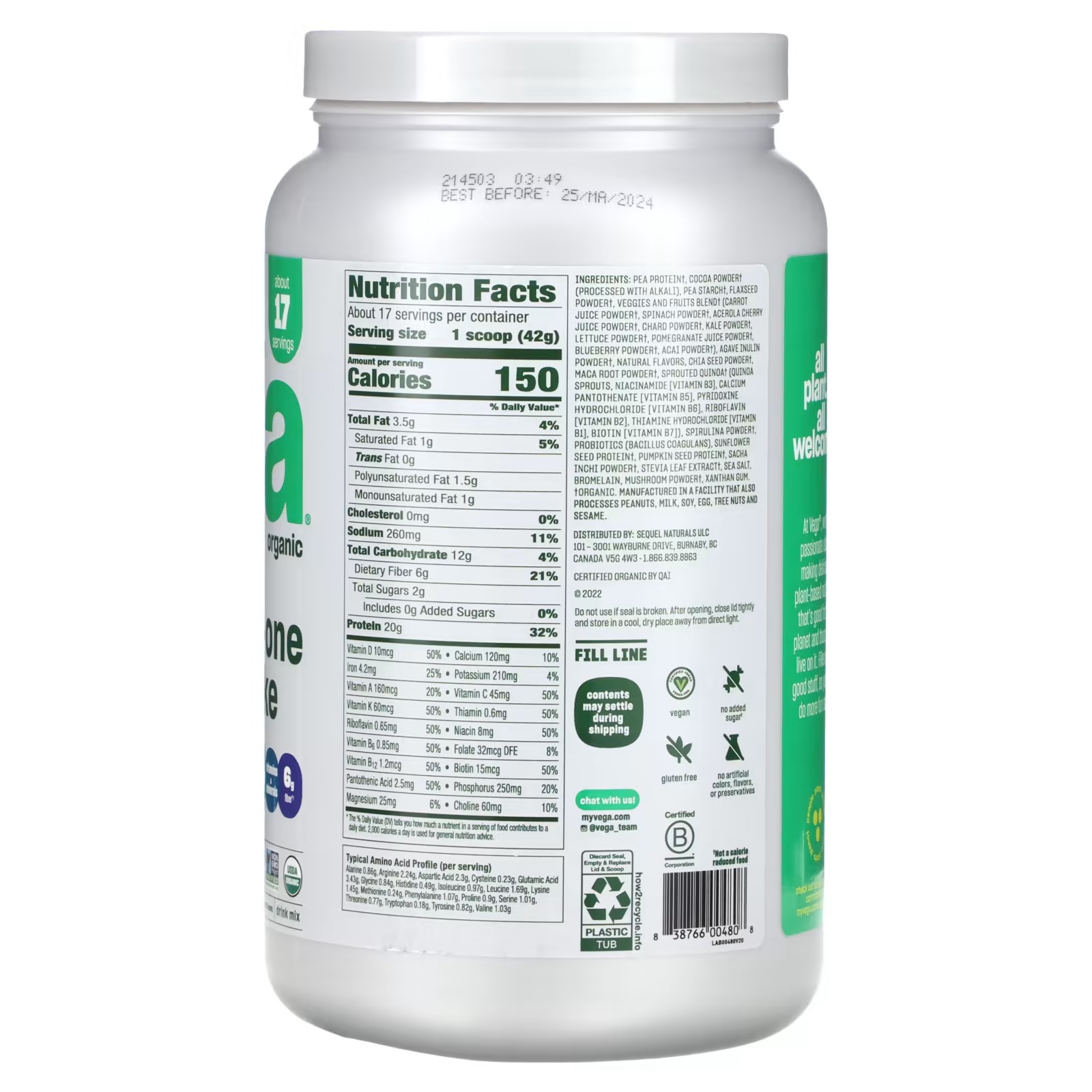 20 g organic protein: a multi-source blend of organic pea, sunflower seed and pumpkin seed protein with 9 essential amino acids