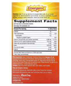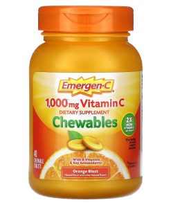 Dietary Supplement2X More Vitamin C Per Chew††With B Vitamins & Key Antioxidants†Natural Flavor With Other Natural FlavorsGreat For on The GoTangy Fruit BlastFor All Around Good HealthFeel The GoodA Burst of Flavor in Every BiteHealth 2X more Vitamin C per chew†† to naturally support your immune systemEnergy B vitamins enhance energy naturallyAntioxidants Excellent source of key antioxidants Vitamin C and Vitamin ENaturally, It’s Good For You.Emergen-C you can chew? Woohoo! Bursting with citrus deliciousness, your tastebuds will have a tangy blast with Emergen-C Orange Blast Chewables. Not only do Emergen-C Chewables have more vitamin C than 10 oranges^, they’re loaded with B vitamins for natural energy support and key antioxidants vitamins C, E and zinc to support your immune system.^Per serving, based on using the USDA.gov nutrient database value for a large, raw orange.††Vs. Leading Immune Support Chewable†Vitamin C,E and Zinc