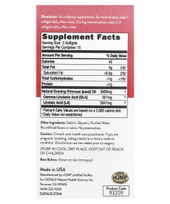 Extra StrengthMenstrual ReliefPromote Skin QualityContain Gamma-Linolenic AcidPromote Wellbeing of WomenCold Pressed OilDietary SupplementQuality Potency EfficacycGMP – Good Manufacturing PracticesCATALO Women’s Evening Primrose Oil Extra Strength Formula is produced from cold pressed evening primrose oil by special technology. Each serving provides a high concentration of 3900mg evening primrose oil. It contains the essential fatty acids, Linoleic Acid (LA) and Gamma-Linolenic Acid (GLA). Evening Primrose Oil can relieve symptoms associated with female menstrual discomfort, improve skin quality and promote cardiovascular health.Evening Primrose Oil Is cold pressed to obtain all nutritious components. It is effective to help relieve symptoms associated with female menstrual discomfort and improve skin quality.GAMMA-Linolenic Acid (GLA)GLA is effective in improving skin quality by moisturizing skin.Health and Beauty from within CAre, viTAlity, Longevity. This is what CATALO stands for. It is our philosophy that true health and beauty radiate from within. We are committed to understanding your health needs and enhancing health through superior natural supplements that nourish your body.Natural – It all begins with care – a healthy body is vital for a happy life – By embracing all of natures goodness, we are proud to offer this wholesomeness directly to you and your family. Wholesome – When it comes to our products, we make no compromises. We are committed to delivering premium products that contain natural, high efficacy, high potency and safe ingredients, which provide the maximum health benefits benefits to our customers. We care because we treat your health as if it was our own.