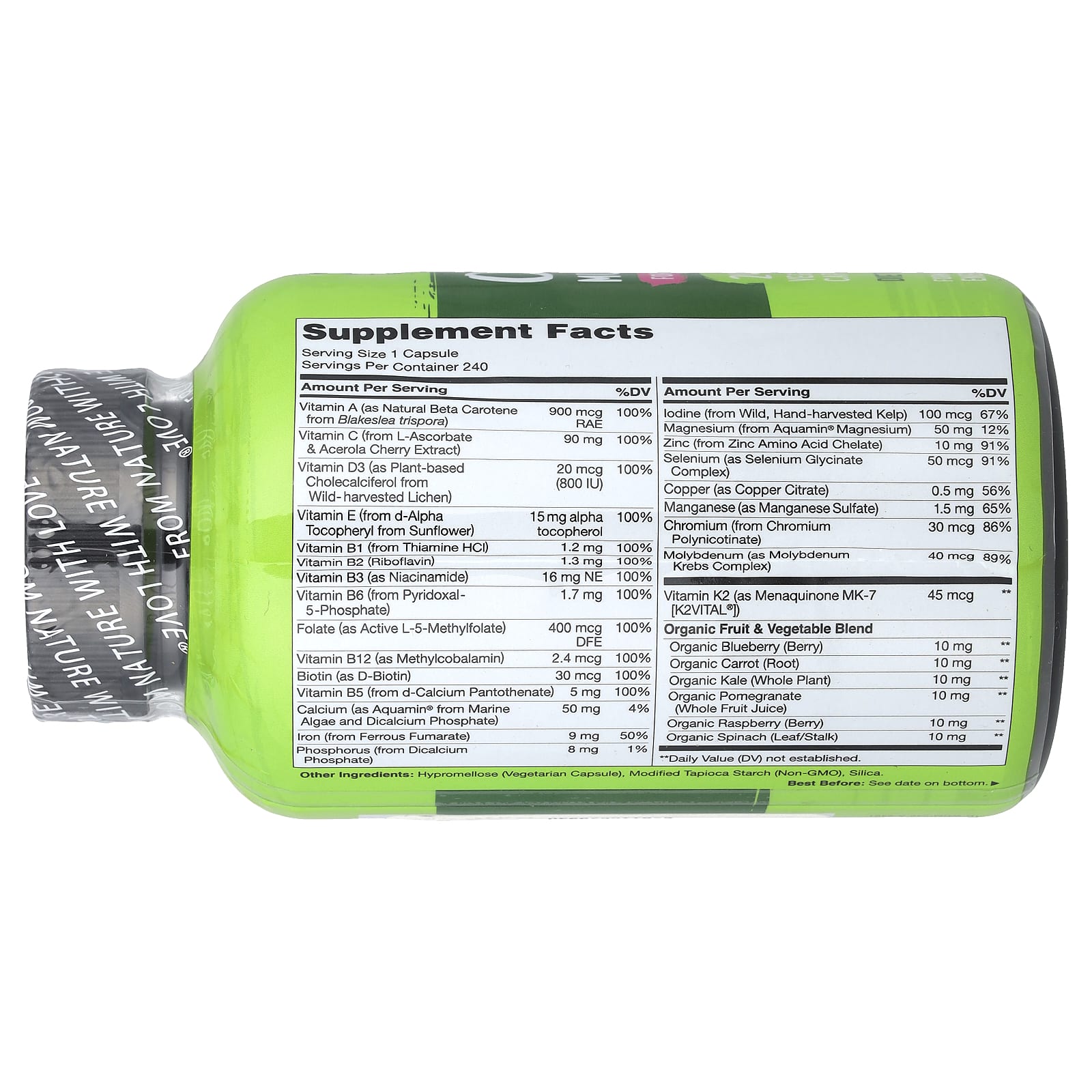 From Nature With Love®Dietary SupplementFormulated to Support Energy, Immune & Bone HealthNo GMOsNo SoyNo GlutenVegan FriendlyNo Coloring, Preservatives or FlavoringGMP – Good Manufacturing Practice – Consistent QualitySuitable For Vegans and VegetariansAll-in-one: Packed with 24 essential vitamins and minerals to support women’s health, plus organic fruits and vegetables for whole food nutrition and antioxidant support, all in just one daily multivitamin for women.Plant-based: Featuring premium plant-based vitamins and minerals such as Vitamin D3 from lichen, Vitamin E from sunflower, Calcium and Magnesium from marine algae, and Iodine from kelp.Bioactive: Includes activated B vitamins like B12 from methylcobalamin, B6 from P-5-P, and MTHFR-friendly Methyl Folate (not folic acid), plus chelated minerals like Zinc and Selenium, for better absorption and bioavailability.Healthy Benefits: Boost your natural energy and vitality and support your heart, brain, eye, and immune health with vitamins, minerals and organic whole foods to round out your diet and help keep your body functioning at its best.