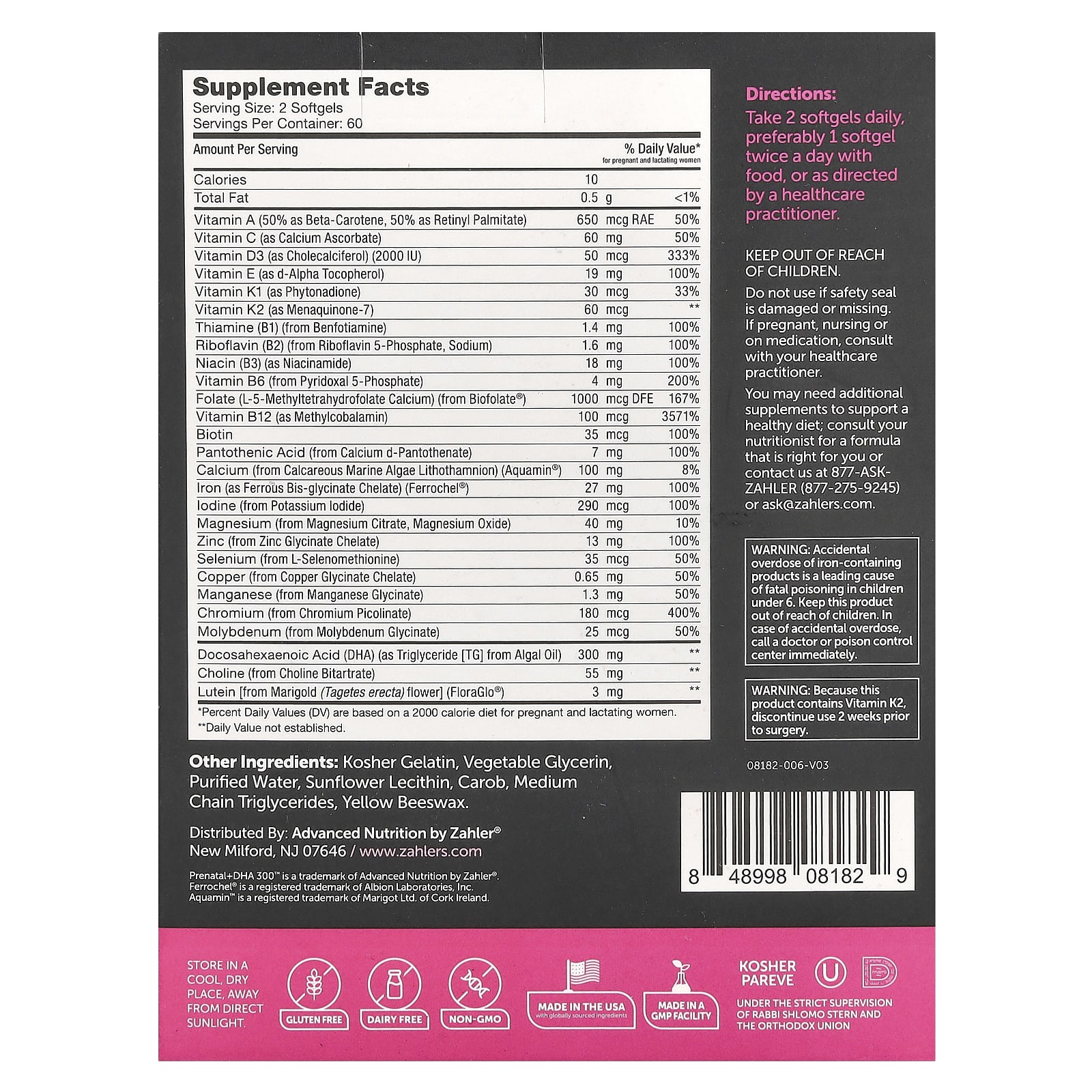 Advanced NutritionConvenient Packs – 2 Month SupplyOptimal FormulaProvides 26 Vitamins & Nutrients + 300 mg DHAOptimum – Bioactive Nutrients – Optimal RatiosPremium Nutrition for Mother & ChildDietary SupplementWomen’s HealthMad in A GMP FacilityNon GMODairy Free Gluten Free Kosher PareveFeel Better, Everyday™Zahler® Prenatal + DHA is a balanced, synergistic formula that provides a curated compilation of nutrients your developing baby requires in the optimal ratios for absorption, metabolism and safety.Healthy Mother Healthy ChildVision – Vitamin A + Lutein + DHABrain – DHA + Zinc + Vitamin B12 + Iron + LuteinBone – Vitamin D3 + Vitamin K2Neural Tub /CNS – Bioactive Folate + Iron + B12Immune System – Iodine + Vitamin A + C + D3 + EMental Health – Iodine + Vitamin D3 + DHA + Folate